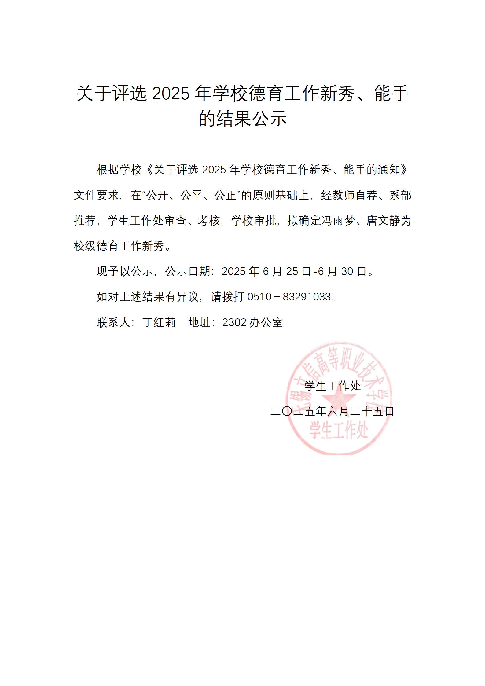 关于评选2025年学校德育工作新秀、能手的结果公示