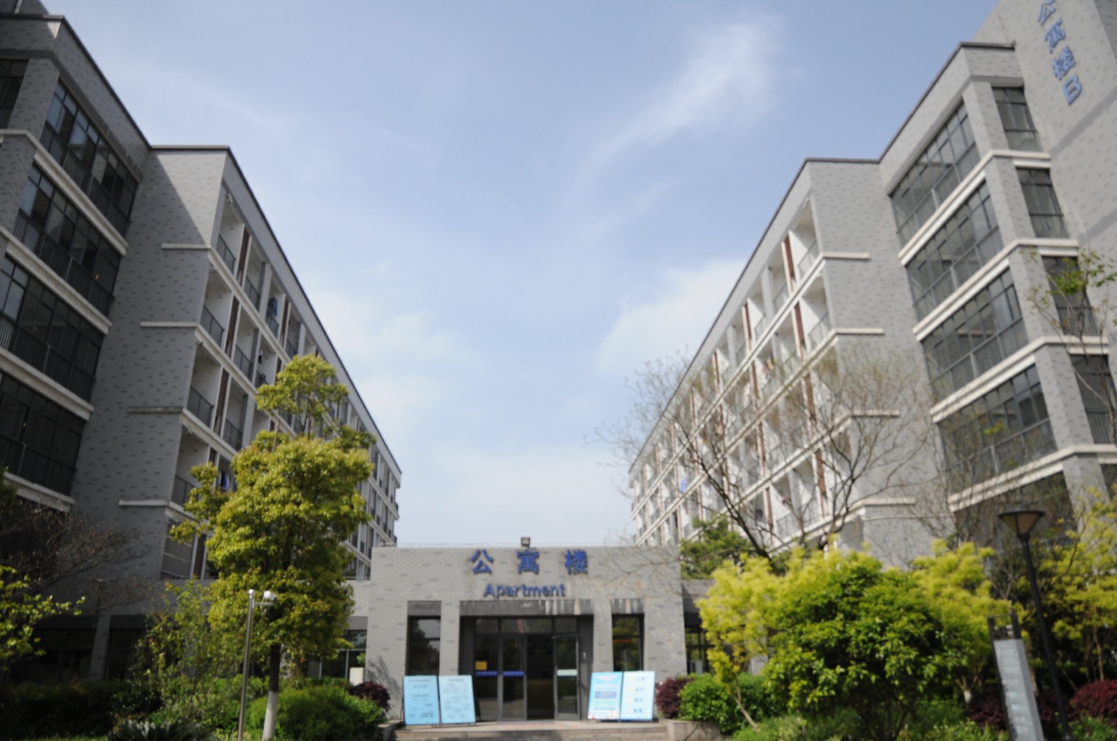 两栋现代化的学生公寓楼。