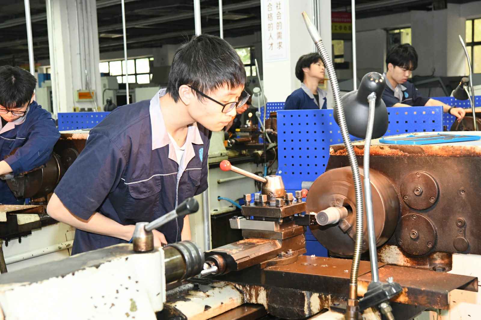看,同学们正在专心致志的进行车工项目实训。