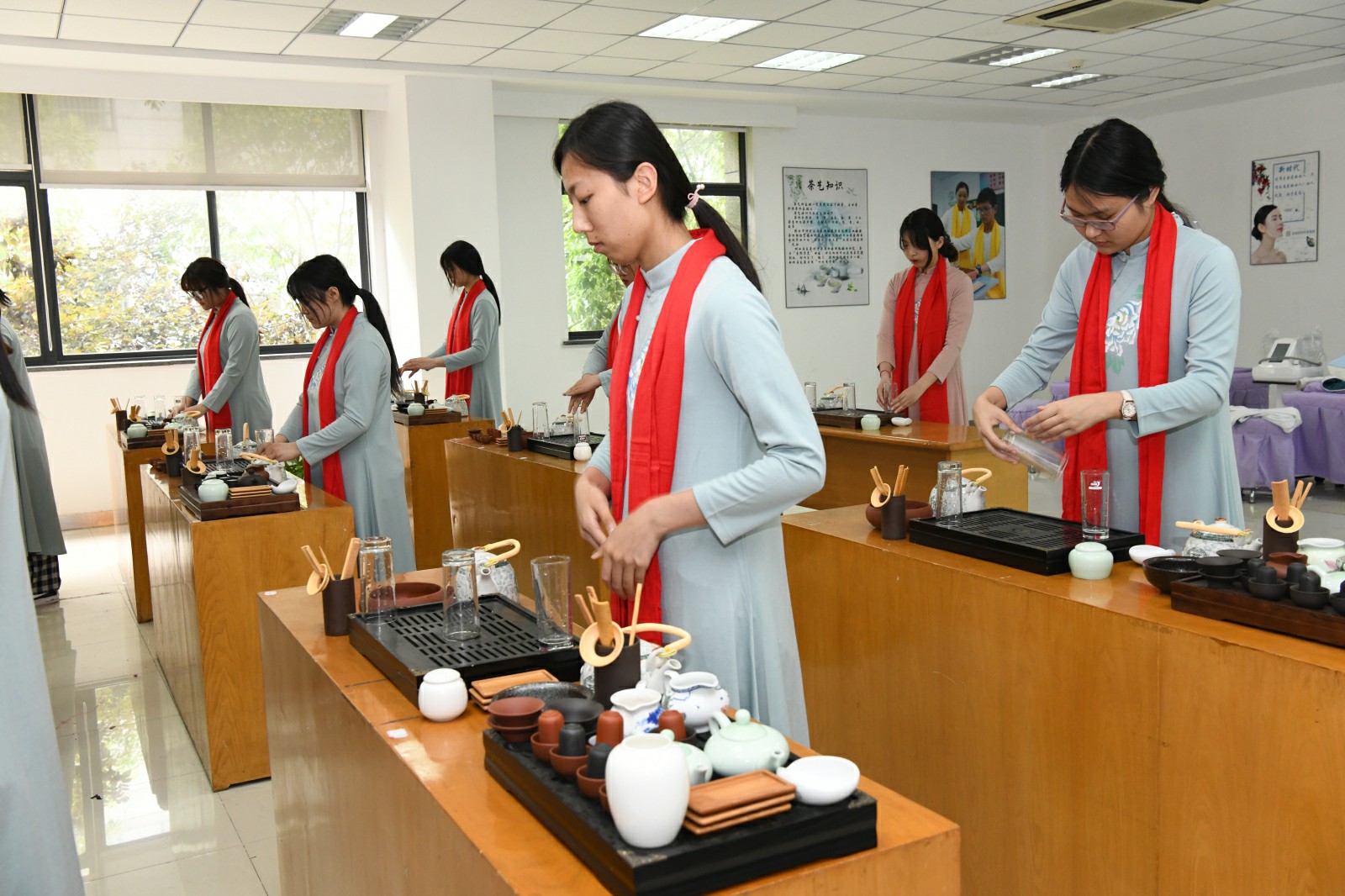 旅游专业的小姐姐都是多才多艺的哦,这是她们在茶艺实训室训练。