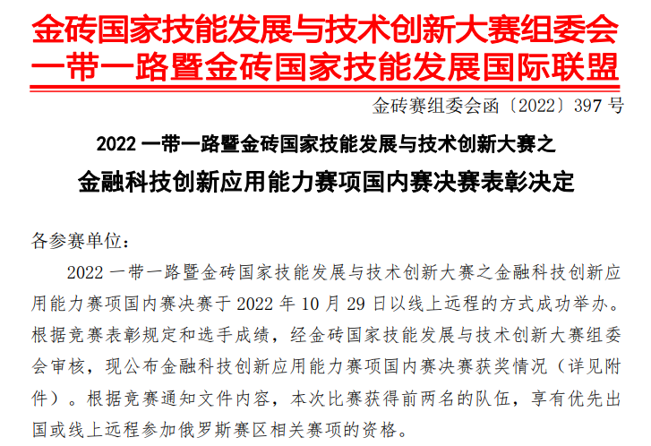 为积极贯彻和落实习近平总书记关于技能人才工作的重要指示精神,共同推进金砖及“一带一路”国家技能发展与创新合作取得更大发展,近日,2022年一带一路暨金砖国家技能发展与技术大赛数智财经赛项(中职组、高职)、金融科技创新应用能力赛项(中职组、高职组)国内决赛圆满落幕。 近日,2022年一带一路暨金砖国家技能发展与技术大赛数智财经赛项(中职组、高职)、金融科技创新应用能力赛项(中职组、高职组)国内决赛圆满落幕。经过激烈角逐,杨健会计名师工作室成员指导的5支参赛队伍获得4个二等奖、1个三等奖的好成绩,学校荣获优秀组织奖!